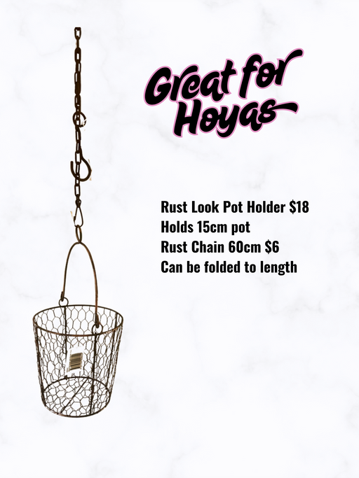 This pot holder holds a 150mm or 15cm pot, smaller pots can be used but may need to be propped up. 60cm chain available and can be folded over or ...