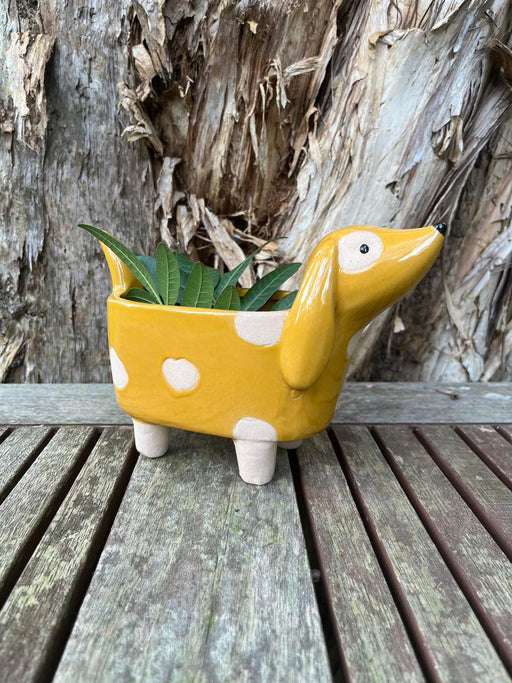 A really pretty "Dijon" coloured dark yellow planter. Pot Details Size - 14cmH (including head) x 7.5W x 20cm long (including head) Plug - Yes has ...