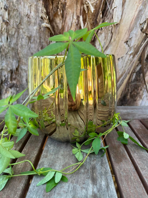 Beautiful shiny gold pot, looks amazing as an accent around darker coloured pots or catch other highlights in the room. Has vertical indentations a...